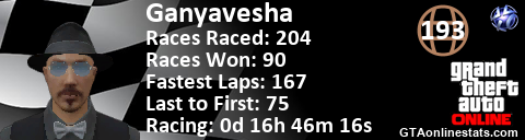 [URL=http://GTAonlinestats.com/showplayer/Ganyavesha][IMG]http://GTAonlinestats.com/racesignature/Ganyavesha/sig.png[/IMG][/URL]