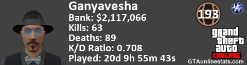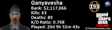 <a href="http://GTAonlinestats.com/showplayer/Ganyavesha"><img src="http://GTAonlinestats.com/signature/Ganyavesha/sig.png" alt="Ganyavesha" border="0" /></a>