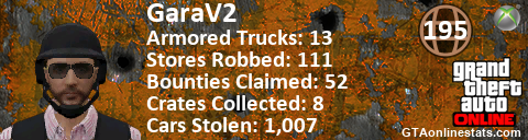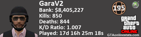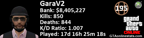 [URL=http://GTAonlinestats.com/showplayer/GaraV2][IMG]http://GTAonlinestats.com/signature/GaraV2/sig.png[/IMG][/URL]