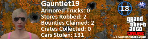 [URL=http://GTAonlinestats.com/showplayer/Gauntlet19/2][IMG]http://GTAonlinestats.com/crimesignature/Gauntlet19/2/sig.png[/IMG][/URL]