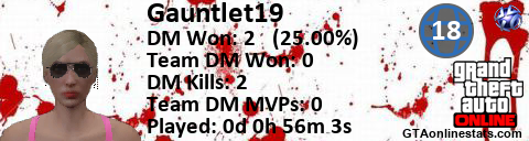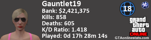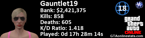 [URL=http://GTAonlinestats.com/showplayer/Gauntlet19/2][IMG]http://GTAonlinestats.com/signature/Gauntlet19/2/sig.png[/IMG][/URL]