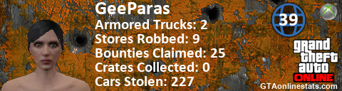 [URL=http://GTAonlinestats.com/showplayer/GeeParas][IMG]http://GTAonlinestats.com/crimesignature/GeeParas/sig.png[/IMG][/URL]