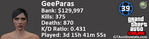 <a href="http://GTAonlinestats.com/showplayer/GeeParas"><img src="http://GTAonlinestats.com/greysignature/GeeParas/sig.png" alt="GeeParas" border="0" /></a>