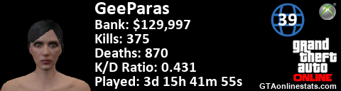 [URL=http://GTAonlinestats.com/showplayer/GeeParas][IMG]http://GTAonlinestats.com/signature/GeeParas/sig.png[/IMG][/URL]