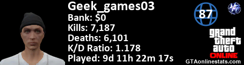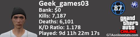 <a href="http://GTAonlinestats.com/showplayer/Geek_games03"><img src="http://GTAonlinestats.com/dmsignature/Geek_games03/sig.png" alt="Geek_games03" border="0" /></a>