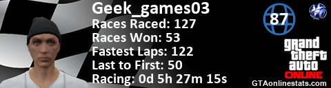 <a href="http://GTAonlinestats.com/showplayer/Geek_games03"><img src="http://GTAonlinestats.com/racesignature/Geek_games03/sig.png" alt="Geek_games03" border="0" /></a>
