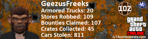 [URL=http://GTAonlinestats.com/showplayer/GeezusFreeks][IMG]http://GTAonlinestats.com/crimesignature/GeezusFreeks/sig.png[/IMG][/URL]