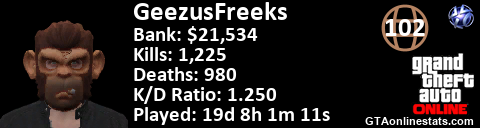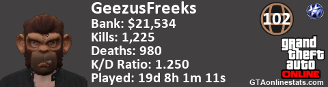 <a href="http://GTAonlinestats.com/showplayer/GeezusFreeks"><img src="http://GTAonlinestats.com/signature/GeezusFreeks/sig.png" alt="GeezusFreeks" border="0" /></a>