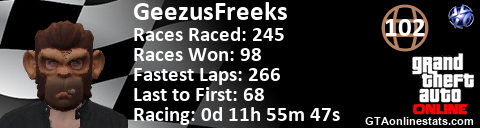 [URL=http://GTAonlinestats.com/showplayer/GeezusFreeks][IMG]http://GTAonlinestats.com/racesignature/GeezusFreeks/sig.png[/IMG][/URL]