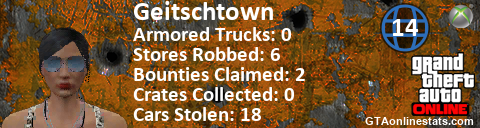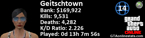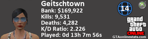 [URL=http://GTAonlinestats.com/showplayer/Geitschtown/2][IMG]http://GTAonlinestats.com/signature/Geitschtown/2/sig.png[/IMG][/URL]