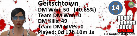 [URL=http://GTAonlinestats.com/showplayer/Geitschtown/2][IMG]http://GTAonlinestats.com/dmsignature/Geitschtown/2/sig.png[/IMG][/URL]