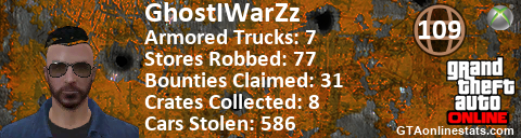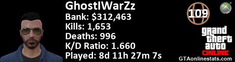 [URL=http://GTAonlinestats.com/showplayer/GhostIWarZz][IMG]http://GTAonlinestats.com/signature/GhostIWarZz/sig.png[/IMG][/URL]