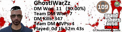 [URL=http://GTAonlinestats.com/showplayer/GhostIWarZz][IMG]http://GTAonlinestats.com/dmsignature/GhostIWarZz/sig.png[/IMG][/URL]