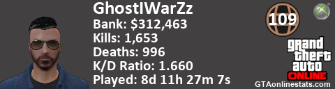 <a href="http://GTAonlinestats.com/showplayer/GhostIWarZz"><img src="http://GTAonlinestats.com/signature/GhostIWarZz/sig.png" alt="GhostIWarZz" border="0" /></a>