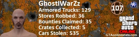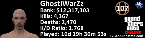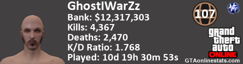 [URL=http://GTAonlinestats.com/showplayer/GhostIWarZz/2][IMG]http://GTAonlinestats.com/signature/GhostIWarZz/2/sig.png[/IMG][/URL]