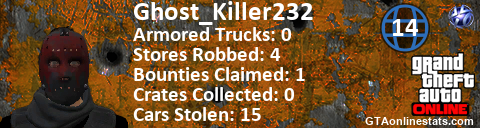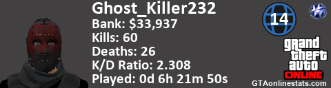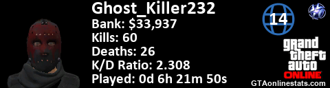 [URL=http://GTAonlinestats.com/showplayer/Ghost_Killer232/2][IMG]http://GTAonlinestats.com/signature/Ghost_Killer232/2/sig.png[/IMG][/URL]