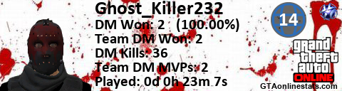 [URL=http://GTAonlinestats.com/showplayer/Ghost_Killer232/2][IMG]http://GTAonlinestats.com/dmsignature/Ghost_Killer232/2/sig.png[/IMG][/URL]