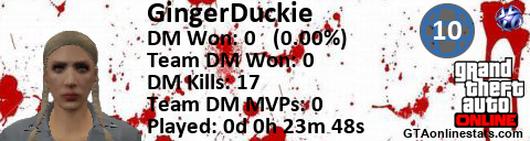 [URL=http://GTAonlinestats.com/showplayer/GingerDuckie][IMG]http://GTAonlinestats.com/dmsignature/GingerDuckie/sig.png[/IMG][/URL]
