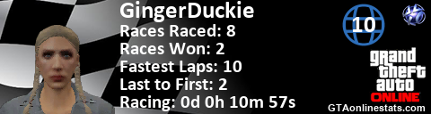 [URL=http://GTAonlinestats.com/showplayer/GingerDuckie][IMG]http://GTAonlinestats.com/racesignature/GingerDuckie/sig.png[/IMG][/URL]