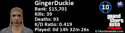 <a href="http://GTAonlinestats.com/showplayer/GingerDuckie"><img src="http://GTAonlinestats.com/signature/GingerDuckie/sig.png" alt="GingerDuckie" border="0" /></a>