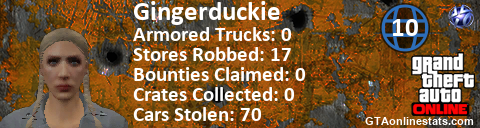 [URL=http://GTAonlinestats.com/showplayer/Gingerduckie][IMG]http://GTAonlinestats.com/signature/Gingerduckie/sig.png[/IMG][/URL]