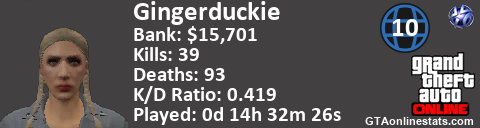 <a href="http://GTAonlinestats.com/showplayer/Gingerduckie"><img src="http://GTAonlinestats.com/dmsignature/Gingerduckie/sig.png" alt="GingerDuckie" border="0" /></a>