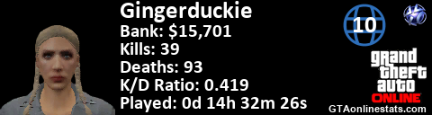 [URL=http://GTAonlinestats.com/showplayer/Gingerduckie][IMG]http://GTAonlinestats.com/dmsignature/Gingerduckie/sig.png[/IMG][/URL]