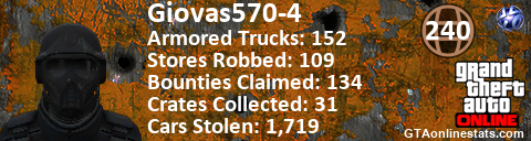 [URL=http://GTAonlinestats.com/showplayer/Giovas570-4][IMG]http://GTAonlinestats.com/crimesignature/Giovas570-4/sig.png[/IMG][/URL]