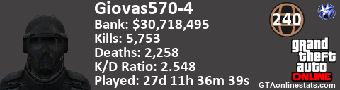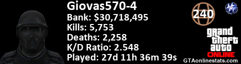[URL=http://GTAonlinestats.com/showplayer/Giovas570-4][IMG]http://GTAonlinestats.com/signature/Giovas570-4/sig.png[/IMG][/URL]
