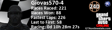 [URL=http://GTAonlinestats.com/showplayer/Giovas570-4][IMG]http://GTAonlinestats.com/racesignature/Giovas570-4/sig.png[/IMG][/URL]