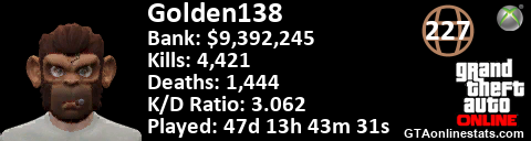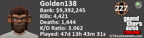 <a href="http://GTAonlinestats.com/showplayer/Golden138"><img src="http://GTAonlinestats.com/signature/Golden138/sig.png" alt="Golden138" border="0" /></a>