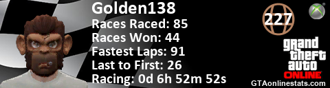 [URL=http://GTAonlinestats.com/showplayer/Golden138][IMG]http://GTAonlinestats.com/racesignature/Golden138/sig.png[/IMG][/URL]
