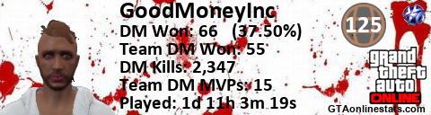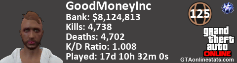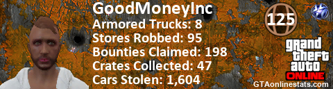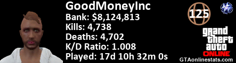 [URL=http://GTAonlinestats.com/showplayer/GoodMoneyInc][IMG]http://GTAonlinestats.com/randomsignature/GoodMoneyInc/sig.png[/IMG][/URL]