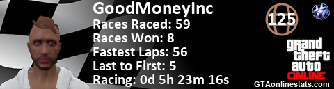 [URL=http://GTAonlinestats.com/showplayer/GoodMoneyInc][IMG]http://GTAonlinestats.com/racesignature/GoodMoneyInc/sig.png[/IMG][/URL]