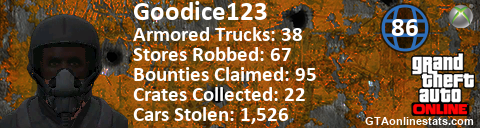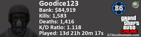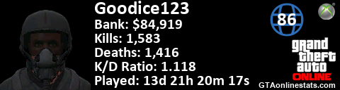 [URL=http://GTAonlinestats.com/showplayer/Goodice123][IMG]http://GTAonlinestats.com/signature/Goodice123/sig.png[/IMG][/URL]