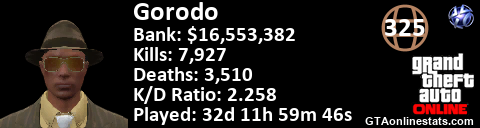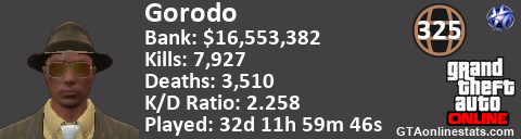 <a href="http://GTAonlinestats.com/showplayer/Gorodo"><img src="http://GTAonlinestats.com/signature/Gorodo/sig.png" alt="Gorodo" border="0" /></a>