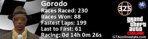 <a href="http://GTAonlinestats.com/showplayer/Gorodo"><img src="http://GTAonlinestats.com/racesignature/Gorodo/sig.png" alt="Gorodo" border="0" /></a>