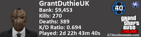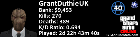 [URL=http://GTAonlinestats.com/showplayer/GrantDuthieUK][IMG]http://GTAonlinestats.com/randomsignature/GrantDuthieUK/sig.png[/IMG][/URL]