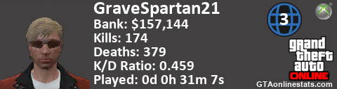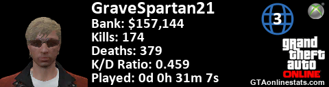 <a href="http://GTAonlinestats.com/showplayer/GraveSpartan21/2"><img src="http://GTAonlinestats.com/signature/GraveSpartan21/2/sig.png" alt="GraveSpartan21" border="0" /></a>