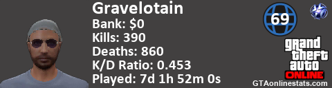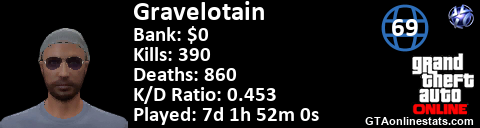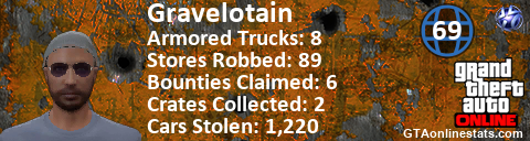 [URL=http://GTAonlinestats.com/showplayer/Gravelotain][IMG]http://GTAonlinestats.com/greysignature/Gravelotain/sig.png[/IMG][/URL]