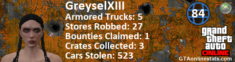 [URL=http://GTAonlinestats.com/showplayer/GreyselXIII][IMG]http://GTAonlinestats.com/crimesignature/GreyselXIII/sig.png[/IMG][/URL]