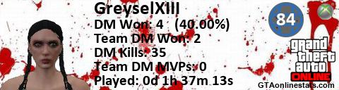 [URL=http://GTAonlinestats.com/showplayer/GreyselXIII][IMG]http://GTAonlinestats.com/dmsignature/GreyselXIII/sig.png[/IMG][/URL]