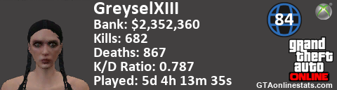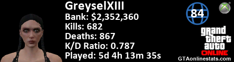 <a href="http://GTAonlinestats.com/showplayer/GreyselXIII"><img src="http://GTAonlinestats.com/dmsignature/GreyselXIII/sig.png" alt="GreyselXIII" border="0" /></a>