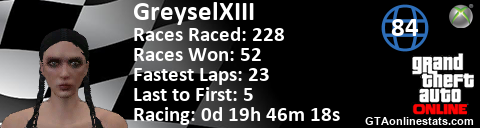 [URL=http://GTAonlinestats.com/showplayer/GreyselXIII][IMG]http://GTAonlinestats.com/racesignature/GreyselXIII/sig.png[/IMG][/URL]