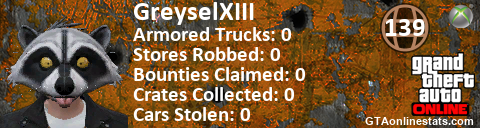[URL=http://GTAonlinestats.com/showplayer/GreyselXIII/2][IMG]http://GTAonlinestats.com/crimesignature/GreyselXIII/2/sig.png[/IMG][/URL]