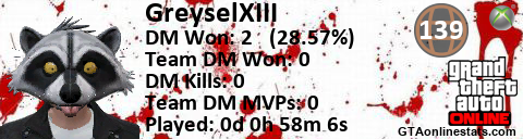 [URL=http://GTAonlinestats.com/showplayer/GreyselXIII/2][IMG]http://GTAonlinestats.com/dmsignature/GreyselXIII/2/sig.png[/IMG][/URL]