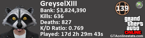 [URL=http://GTAonlinestats.com/showplayer/GreyselXIII/2][IMG]http://GTAonlinestats.com/signature/GreyselXIII/2/sig.png[/IMG][/URL]