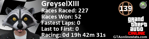 [URL=http://GTAonlinestats.com/showplayer/GreyselXIII/2][IMG]http://GTAonlinestats.com/racesignature/GreyselXIII/2/sig.png[/IMG][/URL]