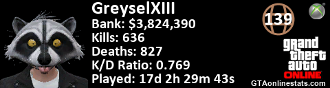 <a href="http://GTAonlinestats.com/showplayer/GreyselXIII/2"><img src="http://GTAonlinestats.com/randomsignature/GreyselXIII/2/sig.png" alt="GreyselXIII" border="0" /></a>
