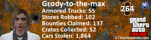 <a href="http://GTAonlinestats.com/showplayer/Grody-to-the-max"><img src="http://GTAonlinestats.com/crimesignature/Grody-to-the-max/sig.png" alt="Grody-to-the-max" border="0" /></a>